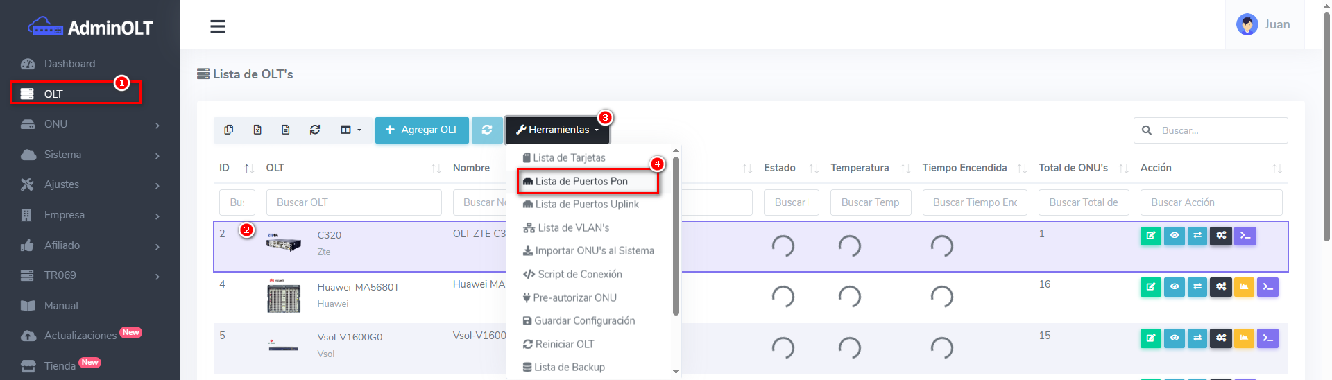 1Diríjase a la lista de OLT's y seleccioné la OLT ZTE en la que quiera reiniciar sus onus por puerto pon.
