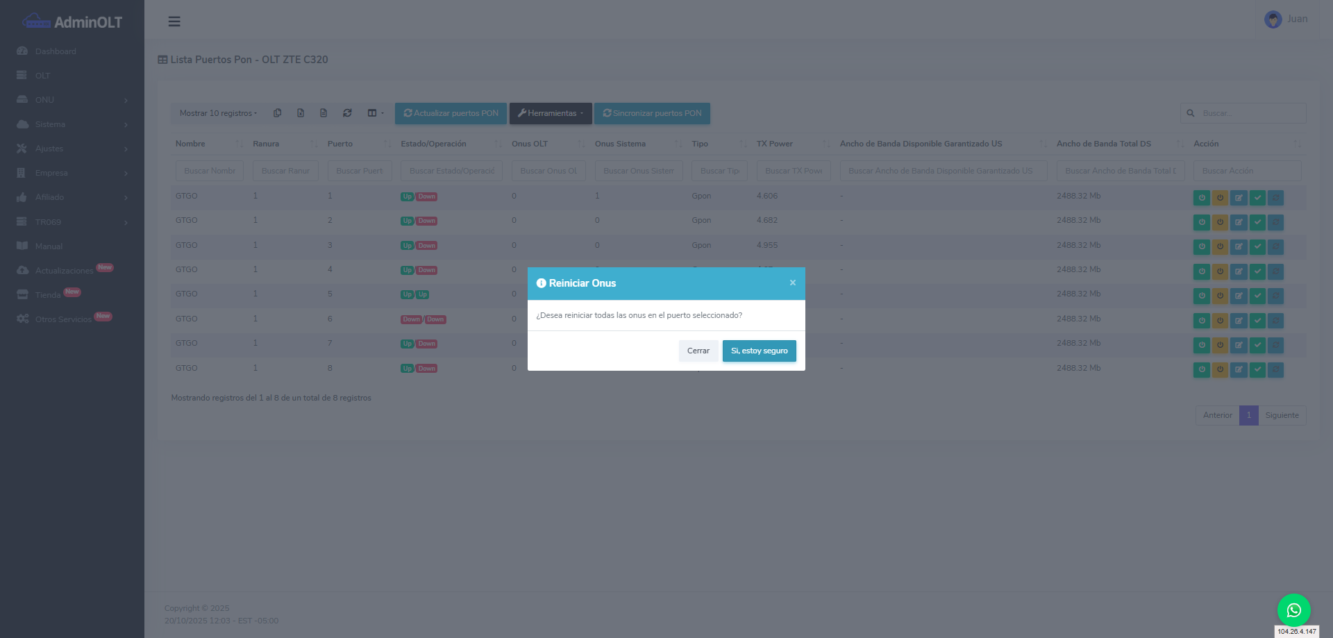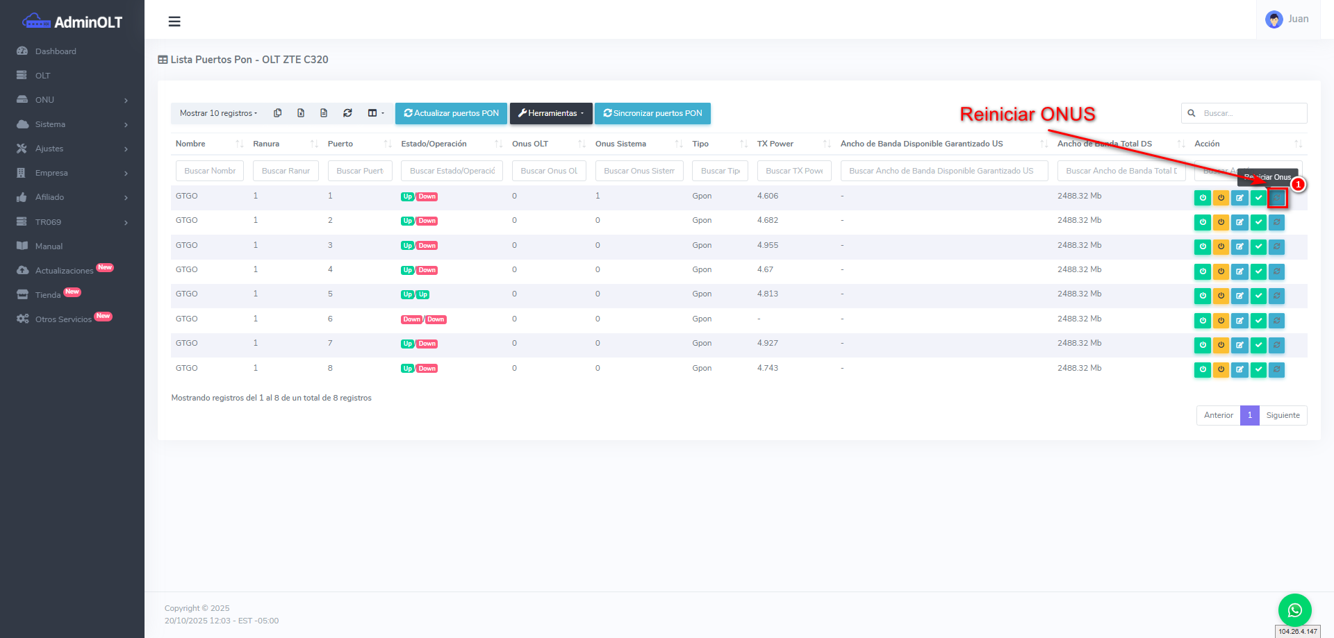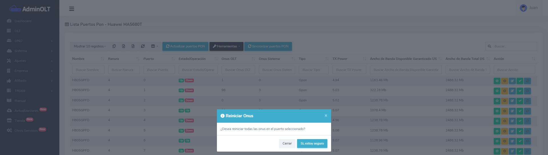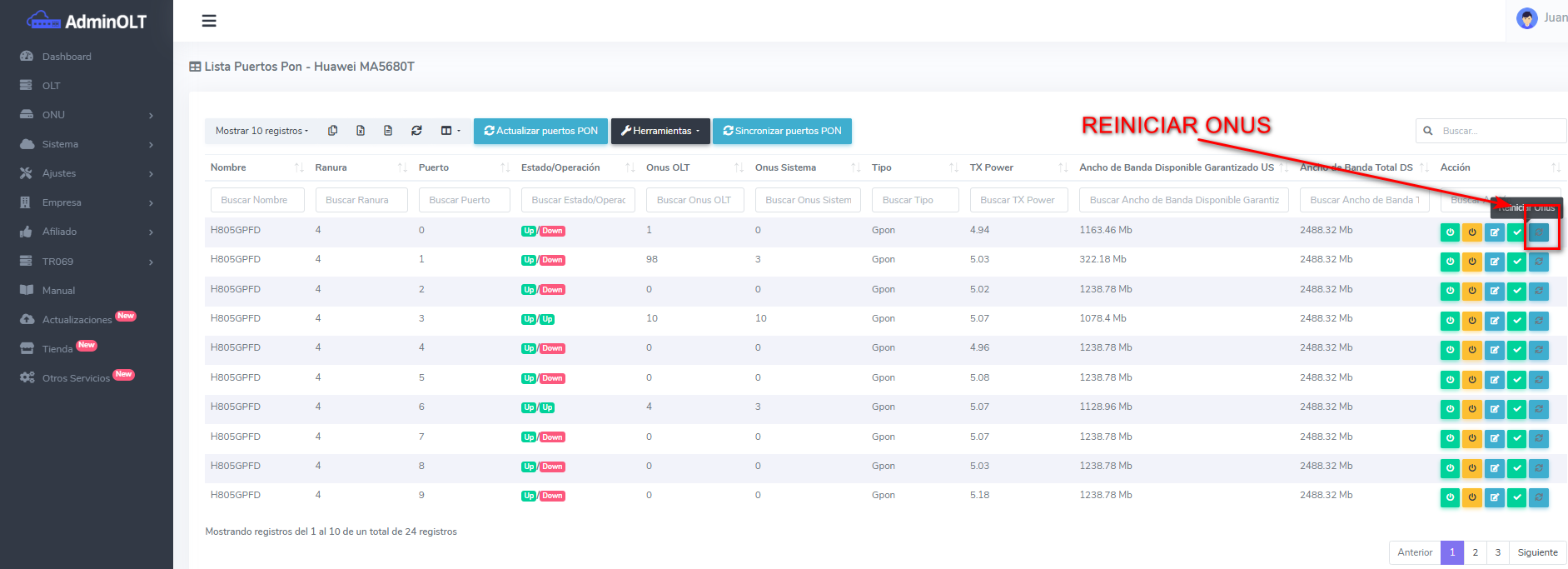 Se integró a AdminOLT la opción de reiniciar todas las onus que estén autorizadas en su OLT.